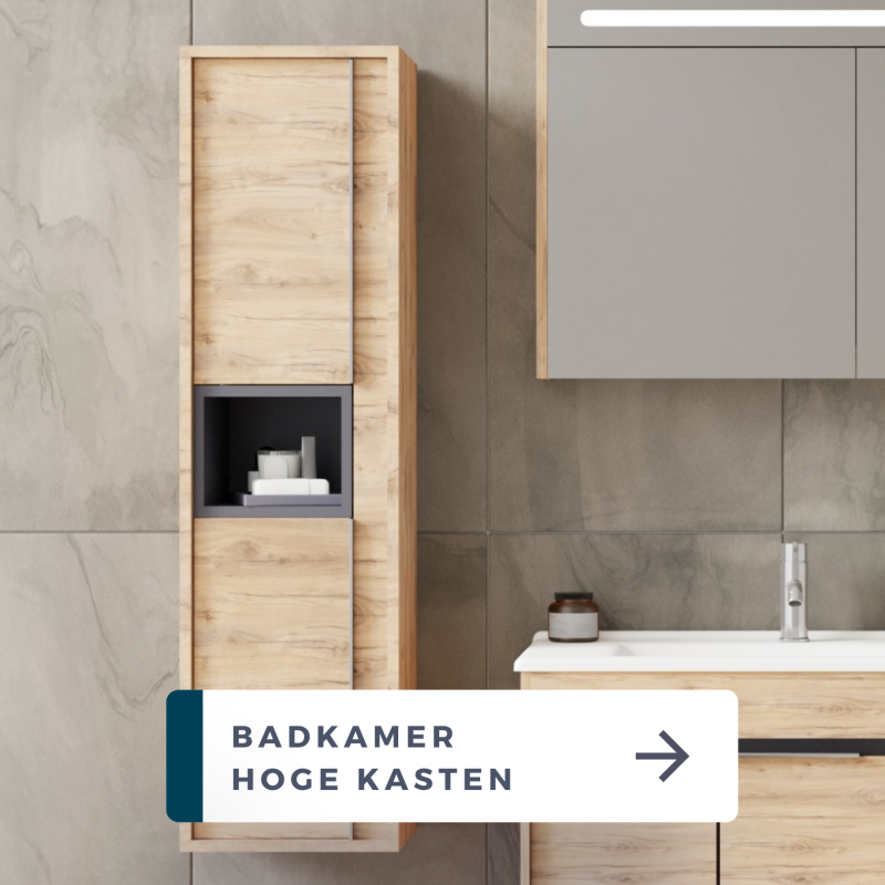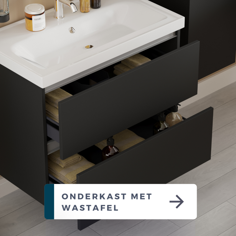 Je kunt ook kiezen om een keramische wastafel te integreren met de onderkasten, en eventueel ook spiegelkasten, led-spiegels en hoge kasten voor extra opbergruimte combineren.