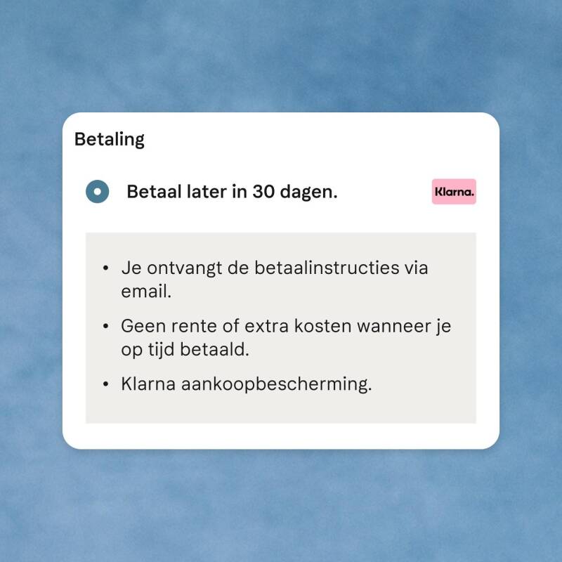 De betaaltermijn van 30 dagen start zodra de aankoop verzonden wordt. Dit betekent dat je de tijd kan nemen om je aankoop uit te proberen. Je betaalt dus alleen voor wat je houdt.