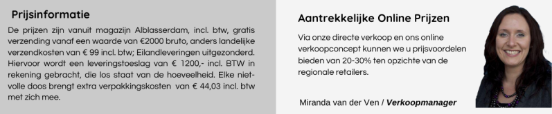 | Artikel Nr. | Product grootte (L x B x H) | Stk/Pkt | m2/Pkt | Kg/Pkt |