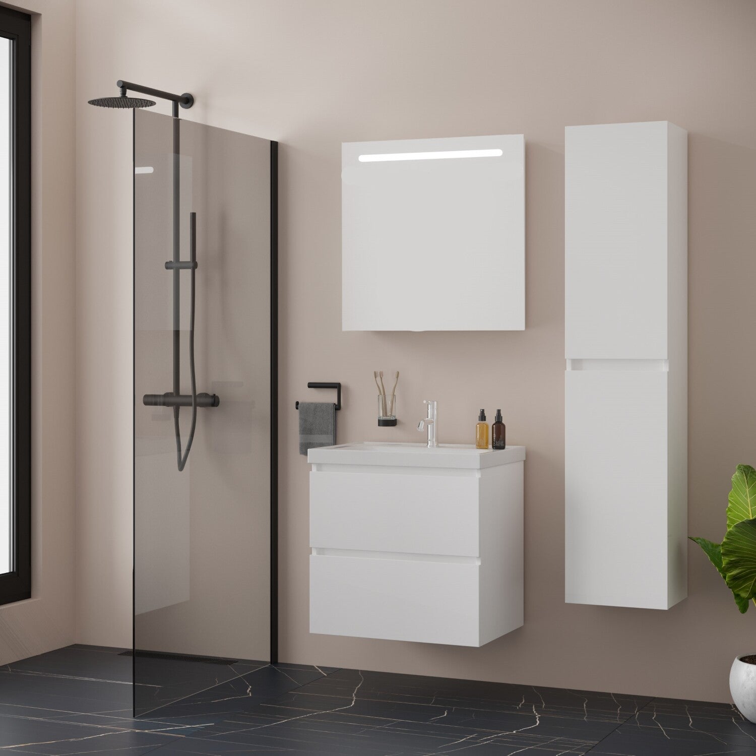 - De Badkamermeubel set prijs is EXCLUSIEF Hoge kast. Toevoegen aan bestelling is mogelijk (meerprijs)