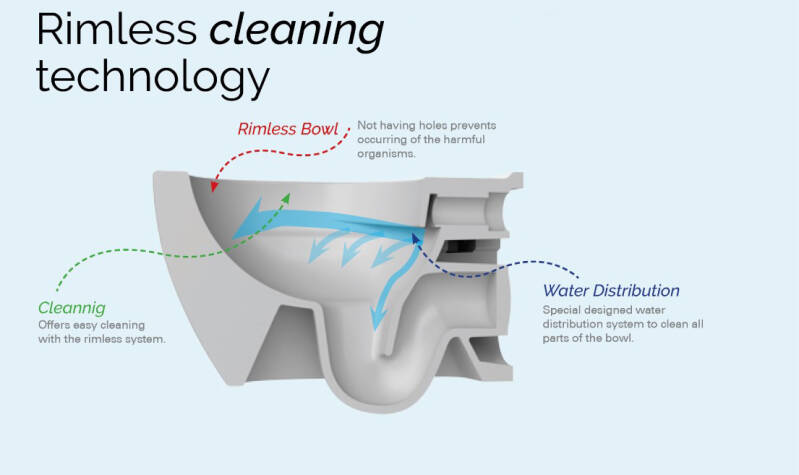 Rimless is een krachtige spoeltechniek waarmee de hele binnenkant van het toilet effectief gespoeld wordt. Het spoelwater wordt naar links en rechts verdeeld en vervolgens wordt hetzelfde water verwerkt. Door deze spoeltechniek kan vuil zich niet meer aan de binnenkant van het toilet afzetten